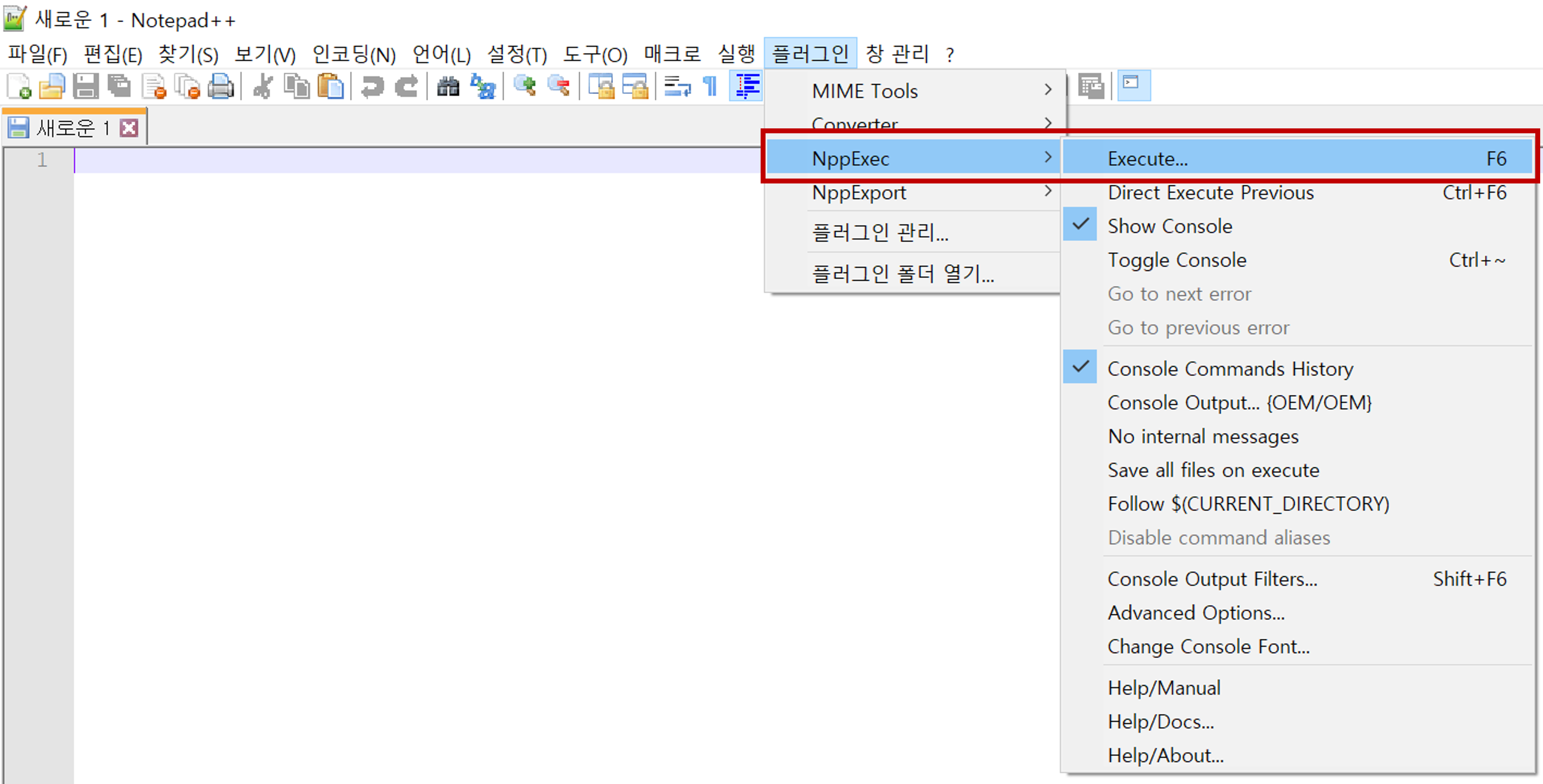 노트패드++이 종료되고 설치가 완료되면 자동으로 다시 실행이 됩니다. 상단 메뉴의 [플러그인] 항목을 눌러보면 [NppExec] 메뉴가 추가된 것을 확인하실 수 있습니다. 여기서 [Execute...]를 항목을 실행하여 보도록 하겠습니다.([플러그인] → [NppExec] → [Execute...])
