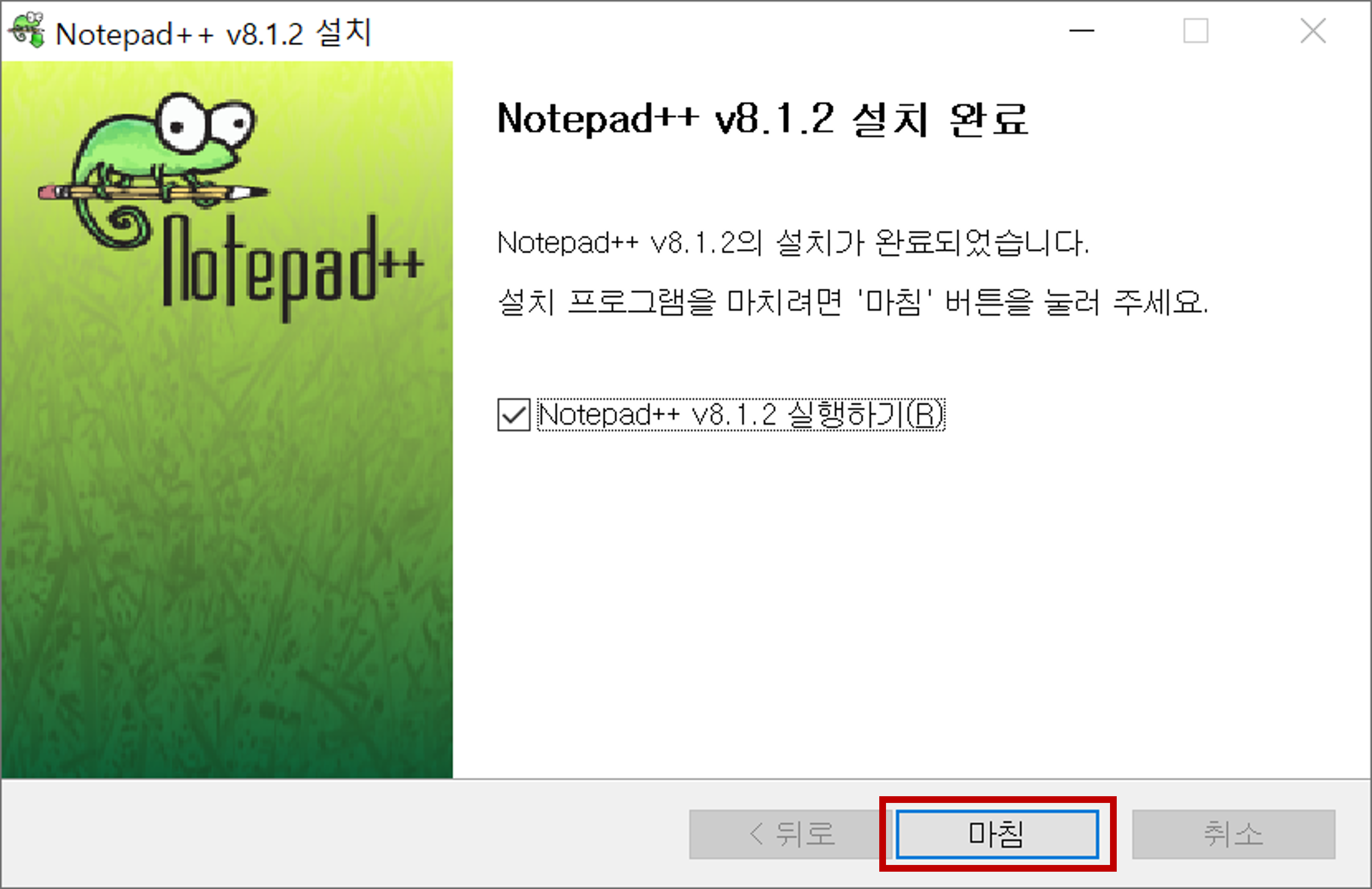 위와 같은 화면이 나오면 노트패드++ 설치가 모두 완료된 것입니다. 여기서 "Notepad++ v8.1.2 실행하기"를 체크한 상태에서 [마침] 버튼을 눌러 바로 실행을 해보도록 하겠습니다.