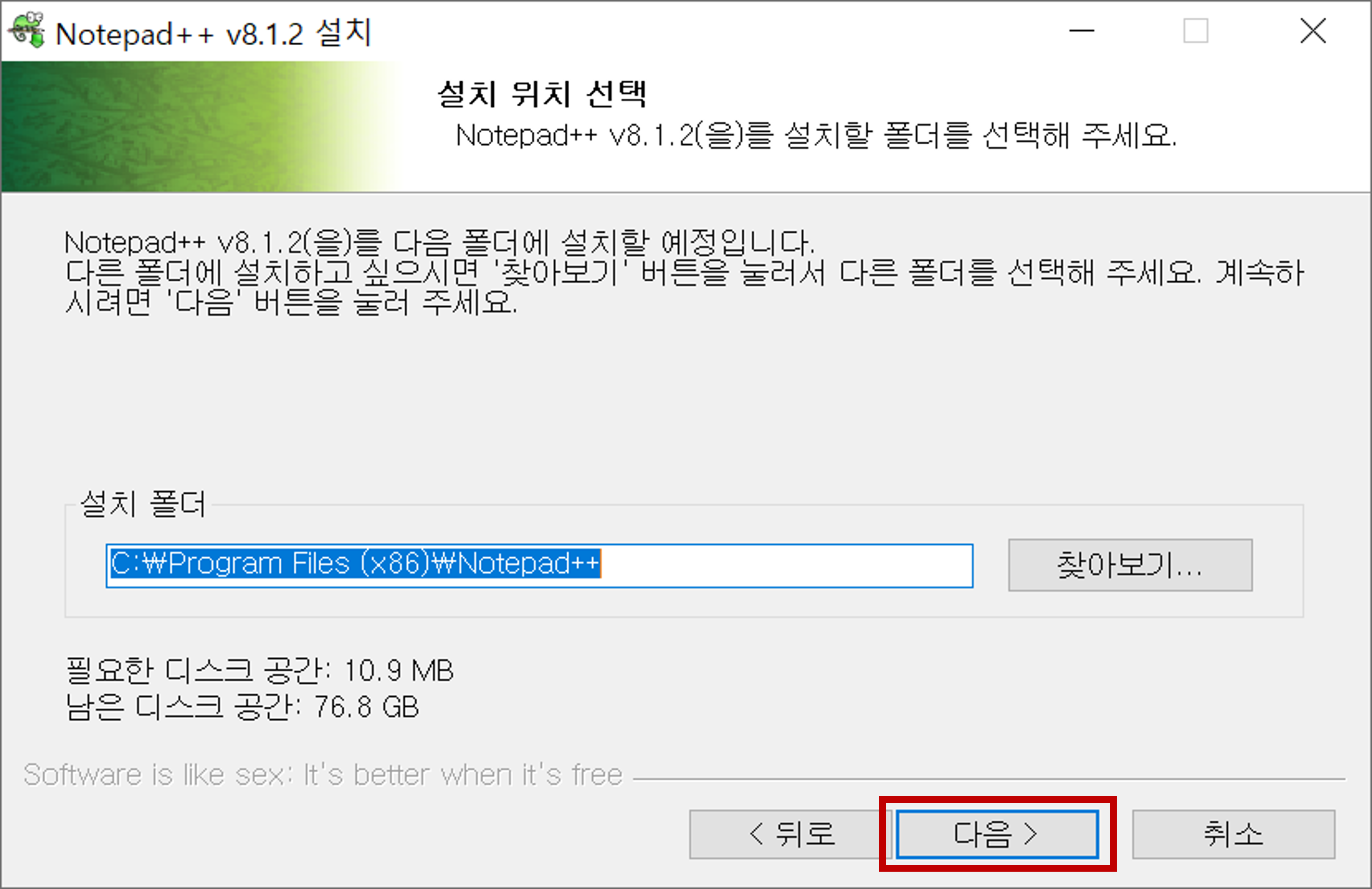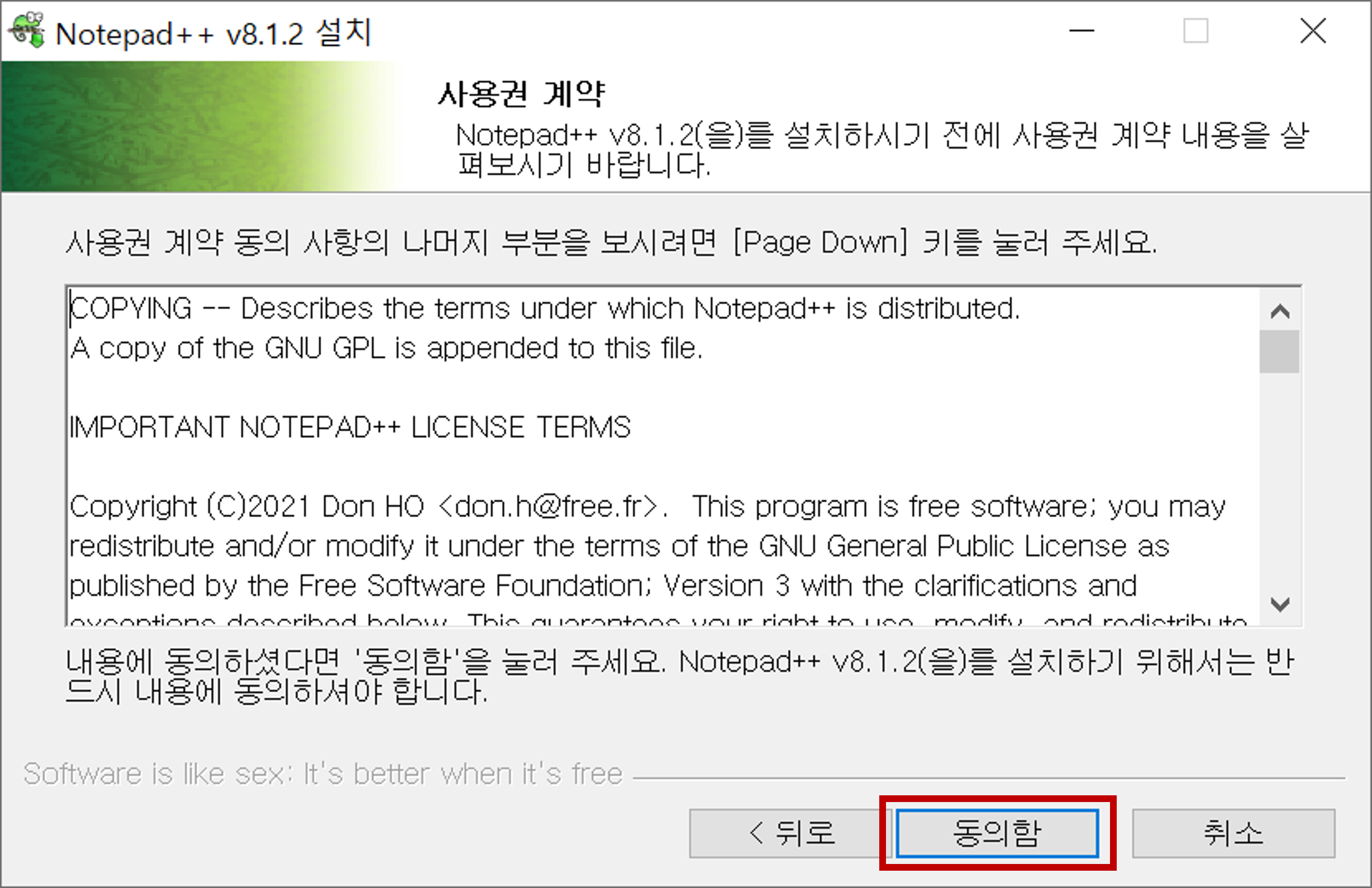 이후 사용권 계약에 관한 내용이 나오는데, 노트패드++은 GNU GPL 하에 배포되는 자유 소프트웨어이며 프리웨어입니다. 내용을 한 번 읽어본 후 [동의함] 버튼을 눌러 계속 진행해주시면 됩니다.
