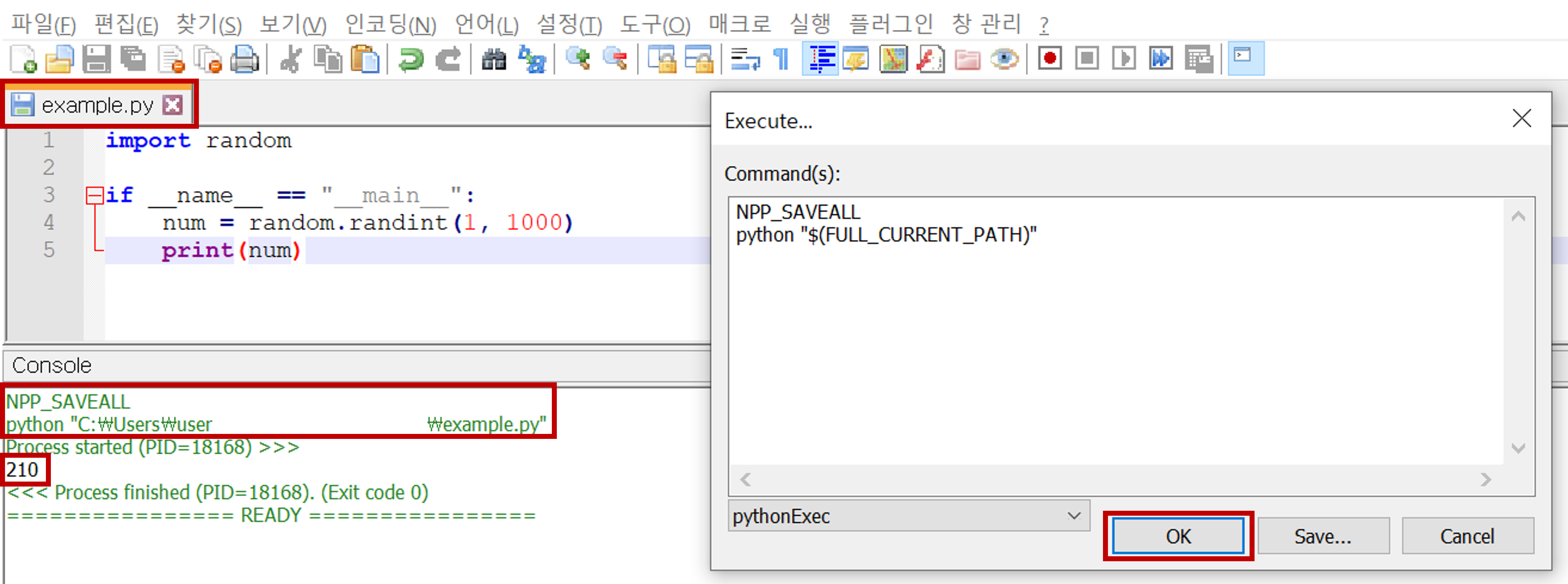 - python "example.py 파일 경로" : 현재 노트패드++로 열려 있는 example.py파일의 경로를 python 인자로 주어 실행합니다.