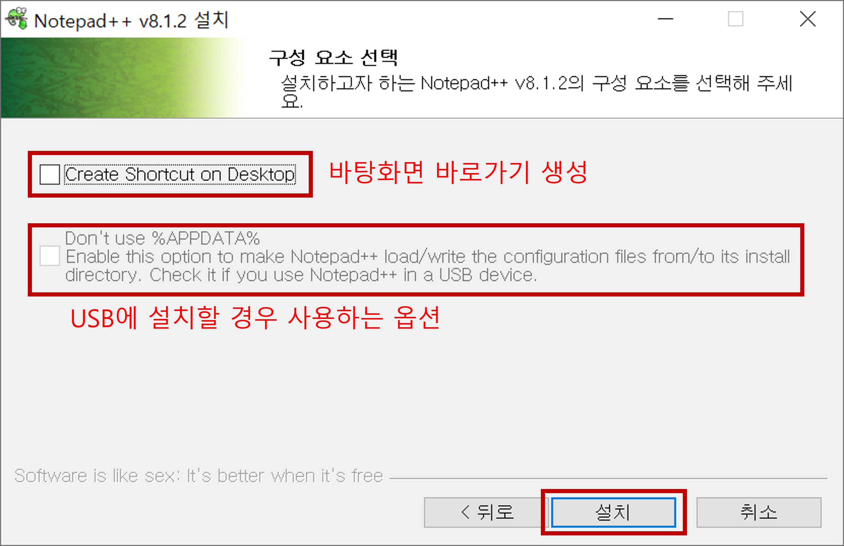 마지막으로 바탕화면 바로가기 생성 및 일부 옵션이 나오는데 이 중 필요한 부분을 선택한 후 [설치] 버튼을 눌러 설치를 진행해주시면 됩니다.(여기서 나오는 옵션들은 Notepad++ 버전에 따라 다소 다를 수 있으며, 내용을 보고 판단하셔서 설치하시면 됩니다.)