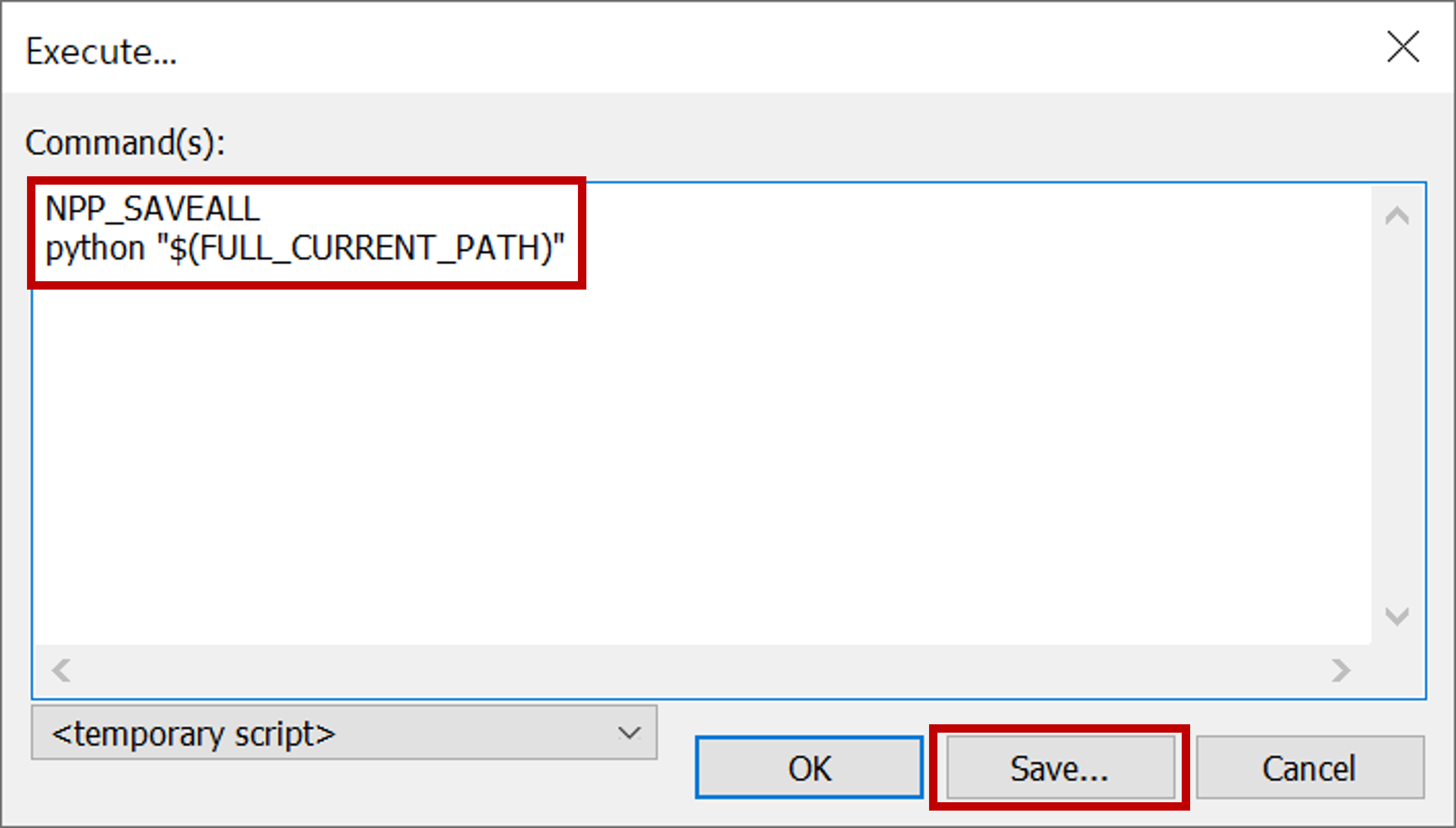 여기서 Command(s) 항목에 위와 같이 "NPP_SAVEALL" 또는 "NPP_SAVE"를 입력하여 줍니다(현재 노트패드++로 실행한 파일을 모두 저장하거나 현재 열고 있는 파일을 저장한다는 의미입니다). 아랫줄에는 'python "$(FULL_CURRENT_PATH)"' 입력하여 주는데 현재 열려있는 파일을 python 실행의 인자로 넘겨준다는 의미입니다. 이후 [Save...] 항목을 선택하여 script를 저장하여 줍니다.