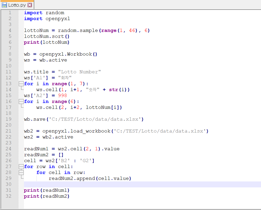 excelFunc.writeLottoNum(wb, lottoNum, 'C:/TEST/Lotto/data/data.xlsx')