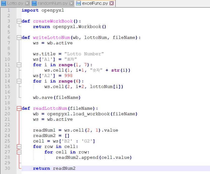 위와 같이 excel 파일을 생성하고, 생성한 번호를 저장 및 읽는 기능을 'excelFunc'라는 모듈로 만들어보았습니다. 이를 활용하여 기존의 'Lotto.py' 내 코드를 수정하면 아래와 같이 작성할 수 있습니다.