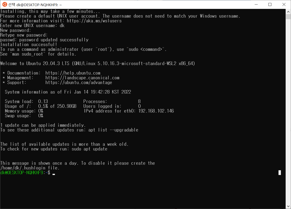 실행 후 모든 설치가 완료되면 아래와 같이 계정 생성을 위한 항목들이 나오며 해당 정보를 입력하면 리눅스를 사용을 위한 WSL 설치가 모두 완료됩니다.