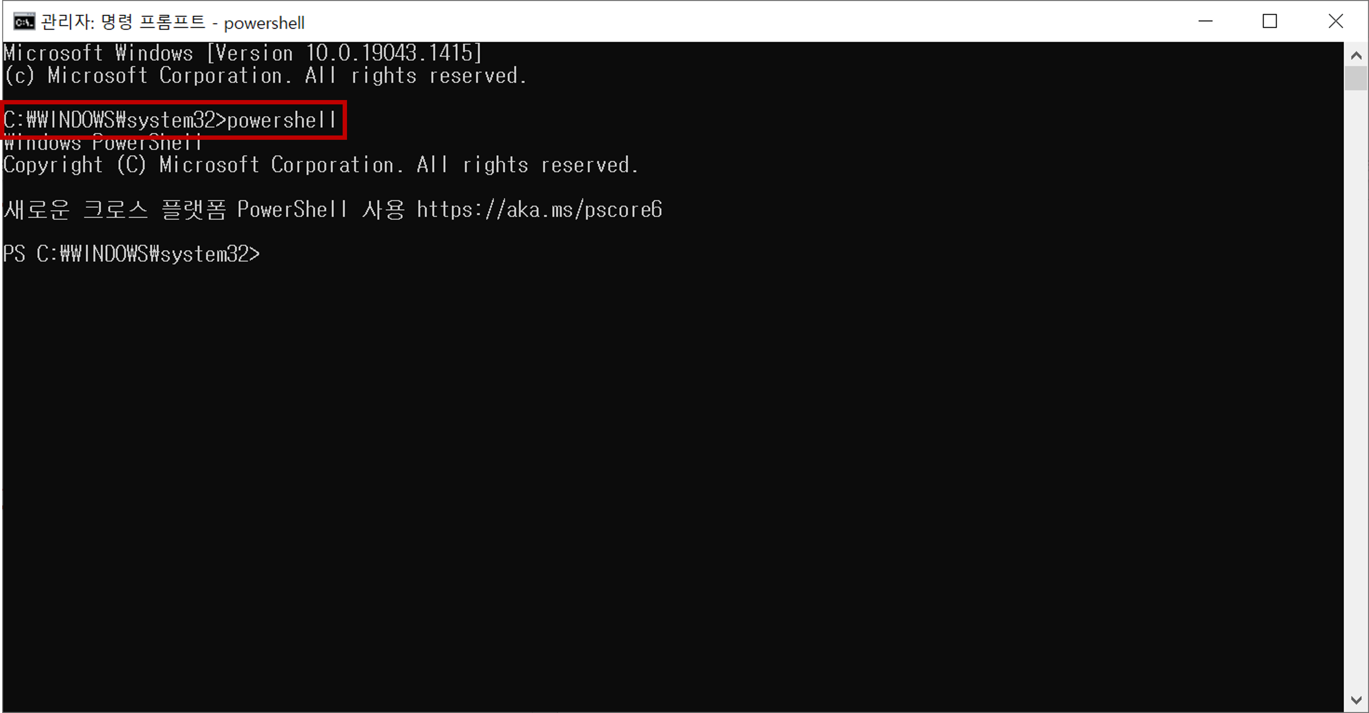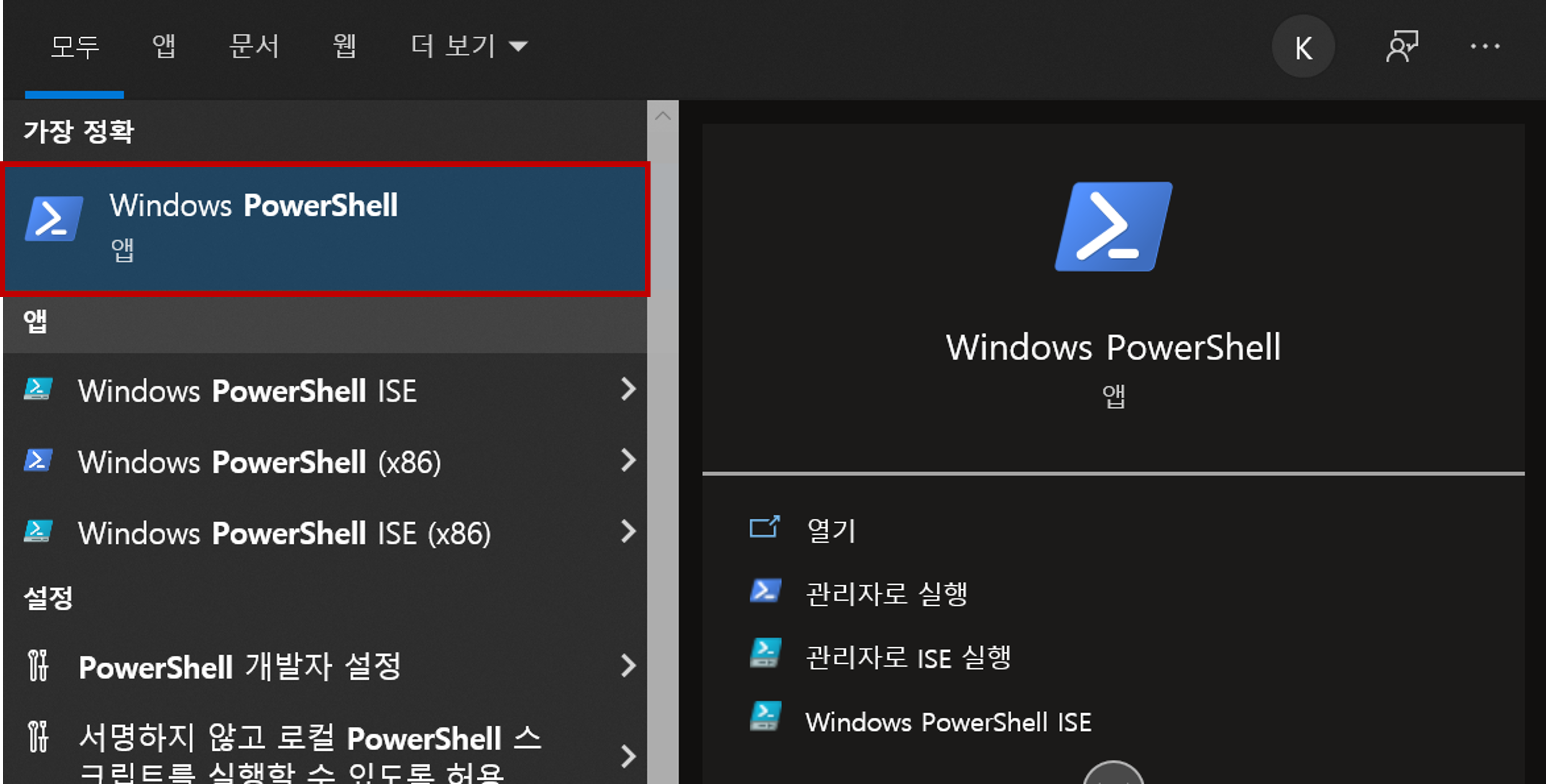 파워쉘은 명령 프롬프트에서 "powershell" 입력 또는 윈도우 검색에서 "powershell"을 검색하여 간단하게 실행할 수 있습니다.(WSL 설치를 위해서는 "관리자 권한으로 실행"을 해주어야만 합니다.)